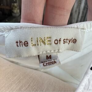 The Line Of Style Wrap Style White Black Polka Dot Blouse Women's Size Medium. In good preowned condition. Super cute with puffy sleeves. Measurements are approximate taken flat.