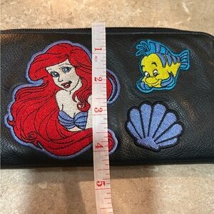 This stylish Disney wallet features vibrant patches of Ariel and Flounder on a sleek black background. Perfect for fans of The Little Mermaid.
