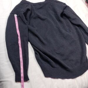 Stay warm and stylish with this classic black cardigan sweater. Perfect for layering, it offers both comfort and elegance. There are 2 pockets in the front and slight pulling on the sweater
