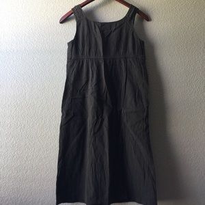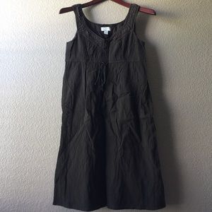 Brown/olive gauze with crocheted neckline and straps, fully lined, drawstring waist. Pull on (no zippers or buttons). Back of one strap has been resewn. Garment has slight green shade to it. Perfect with orange or turquoise accessories! Brown espadrilles separate listing (size 9). 16½" across bust, approx. 37" long.