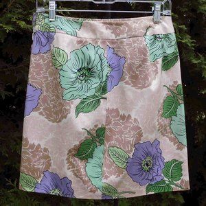 Ann Taylor Loft pretty tan, green, and lilac pleated front floral skirt featuring a side zip single button closure and two front pockets with button detail