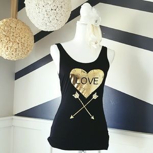 The love tank is made of 95% cotton and 5% spandex. Black with gold "Love" heart and cupid arrows on the front. Scoop neck. Turn inside out and wash in cold. Tumble dry on medium heat. Do not iron or it will melt the design on front. Tank has never been worn, tag still attached.