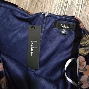The Lulu's Buy You Flowers Navy Floral Print Velvet Strapless Midi Formal Dress in XL is a stunning and elegant choice for formal occasions like weddings, parties, or cocktails. This sleeveless dress features a beautiful floral pattern in a rich blue color, with a luxurious velvet fabric that adds a touch of sophistication. The strapless style and midi length give it a sexy and romantic vibe, perfect for the summer, fall, or spring seasons. The dress also includes a zip closure for easy wear and is designed by the brand Lulus, known for their stylish and high-quality women's clothing.