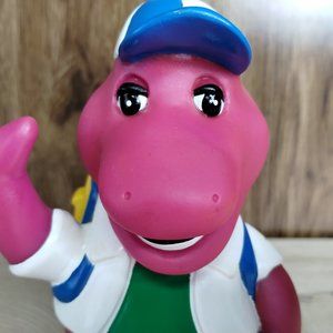 Pre-owned The Lyons Group Barney the Dinosaur plastic coin bank. Has plug still. Measures approx. 7" tall. Marked 1992. Vintage. In good condition. Shows normal signs of age/use including some light discoloration and stray marks.