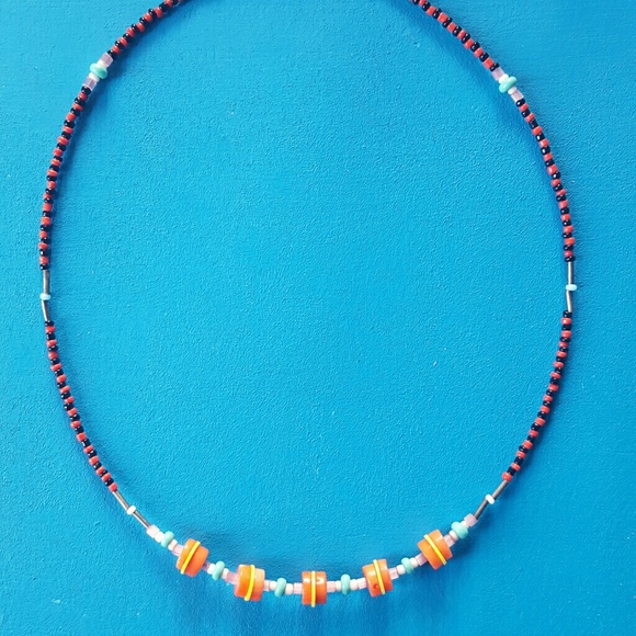 Mini charm necklaces made from an assortment of various glass, rice, seed, stone, and clay beads from West Africa. Delicate but bold, these necklaces are sure to add a little something special to your ensemble. This family group 17.5" in length.