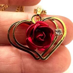 The Marquis Collection gold tone heart pendant with red rose necklace and earrin