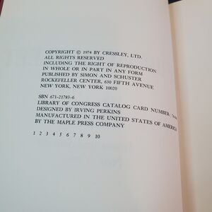 Spine leans to right. A couple small marks or discoloration spots on exterior edges of pages. Yellowing to dust jacket visible on outside and interior cover. Some creasing or wear at top and bottom of spine of dust jacket.