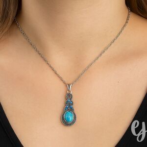 The Mavi pendant necklace is laidback luxury in a swirling twist of rhinestones and a turquoise blue cabochon. A braided, beaded silver tone setting adds lift and movement.