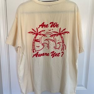 The Mayfair Group "Greetings From My Feelings - Are We Aware Yet". 100% cotton. Oversized short sleeve sand colored t-shirt with red graphics. Machine washable. Graphic print at front and back. Size Medium/Large. NEW WITHOUT TAGS.