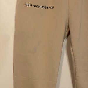 Comfortable and stylish tan sweatpants perfect for casual wear. Features motivational text for added inspiration.