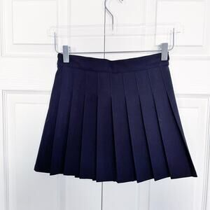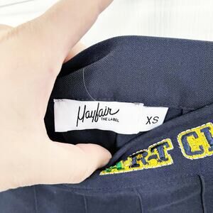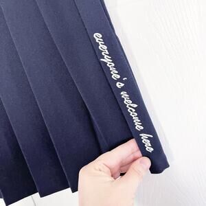 Navy mini, box pleated tennis skirt. "Mayfair Art Club" is embroidered across the waistband and "everyone's welcome here" is embroidered on the pleat. Some stretch.