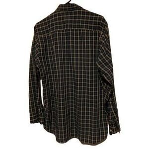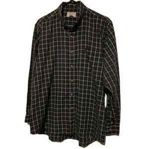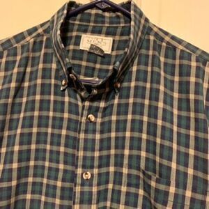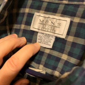 The Men’s Store At Sears Size Plaid Long Sleeve Button Shirt. Green, blue, white plaid. 65% polyester/35% cotton. 24” armpit to armpit, 32” long. Shirt is light weight.