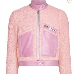Add a pop of luxe edge to your winter wardrobe with this stunning jacket from The Mighty Company. Crafted by hand in sunny Mexico, this one-of-a-kind piece features a cozy pink-tan shearling body (80% acrylic, 20% polyester) with smooth lamb leather contrast panels in bubblegum pink. Fully lined in soft rayon with polyester ribbed cuffs in pink and red for a playful finish.