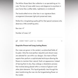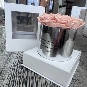 Light pink roses in silver mirror box. Includes all original packaging. The ones I have are a lighter pink than in the stock photo. The site advertises that these last 3+ yrs and I’ve had some for 7yrs and they still look flawless. This box of roses for sale I’ve had just over 2yrs, still so much life left!