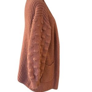 The Mint Pompom Cardigan Swester Size Small. Featuring a Terracotta Red, Knit Fabric, Pompom Textured & Long Bubble Sleeves and Two Pockets
