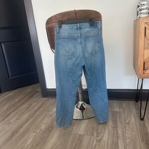 Classic straight leg jeans in a light blue wash. High-rise waist for a flattering fit.