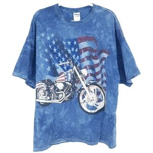 The Mountain Biker Patriotic Motorcycle Men's 2XL USA Flag 2008 Greg Giordano Gildan Tag Blue Tie Dye. Great used condition, however there are a few light stains, some on bottom front and one on the back bottom, all stains seen in last 3 photos. Should be easy to stain treat but I didn't notice them until photographing.