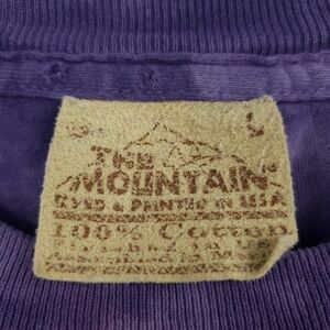 The Mountain Large Vintage Native American Wolf Snow Tie Dye Purple Tee Shirt Worn Holes Thrashed Super Soft 2003. Super worn in shirt with lots of wash wear (super soft), has many small holes throughout as well as bleach stains, etc. Adds to the fun vintage character.