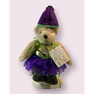 Muffy VanderBear plush bear from 1996, part of the "A Salad Ballad: Waltz of the Vegetables" collection. Muffy VanderBear, has black eyes, wears a hat, and stands at 8 inches tall. It is a beige color with purple outfit, and represents a dancer theme within the Muffy VanderBear franchise. The item is an original production and comes with 2 items, weighing 6 ounces.