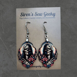 Great for classic horror fans- dark floral earrings featuring the Mummy. Printed portion is 1.5" tall made of sublimated MDF and total length of about 2.5" with hypoallergenic stainless steel hooks.