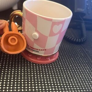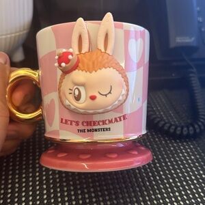 Charming mug featuring The Munsters design. Pink with gold handle and heart accents.