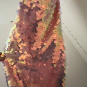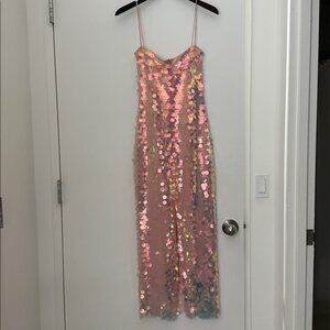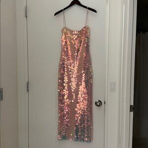 NEW WITH TAGS never worn, tried on was too small. Size FR/EU 34, US 0 XXS-XS. My measurements are 34.5 - 25 - 35 and this was one size too small for me, I took a 36 instead. It is a gorgeous, unique, and RARE dress that is no longer produced by The New Arrivals. Original retail is $875. Midi length covered in large holographic pink/white/purple paillettes and fully lined. Thin spaghetti straps and back zipper.
