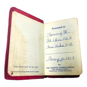 Pocket Mini Bible. Imitation red leather. Copyright 1968, this is the 1982 edition book is in good to very good condition. With extremely light wear and tear. Some marks as shown in pictures. Questions are welcome.