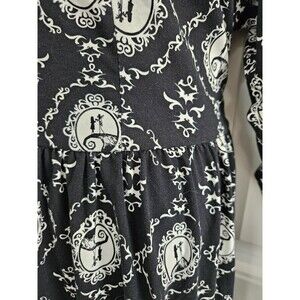 This is a Disney brand dress featuring a cameo design of Jack Skellington and Sally from "The Nightmare Before Christmas." Originally purchased from Hot Topic, it is a plus size 3 (3X) with a collared neckline, long sleeves, and button closure. The dress is knee-length, made of black knit fabric with a fit & flare style. It includes stretch material, pockets, and a chain accent, suitable for travel, parties, or casual wear.
