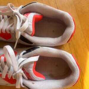 The Nike Air Max 9 Infrared (2010) is a versatile sneaker suitable for both athletic activities and casual wear. The outsole of the Air Max 90 is known for its waffle pattern, which contributes to traction and durability. The AM90 features a paneled upper with a mix of materials, which include mesh, synthetic materials, and real leather. The shoe's design often incorporates a combination of contrasting colors and textures. The color palette is primarily red, gray, black, and white.