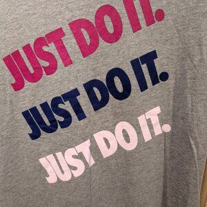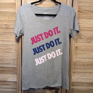 Heather gray Nike t-shirt featuring 'Just Do It' in vibrant colors.