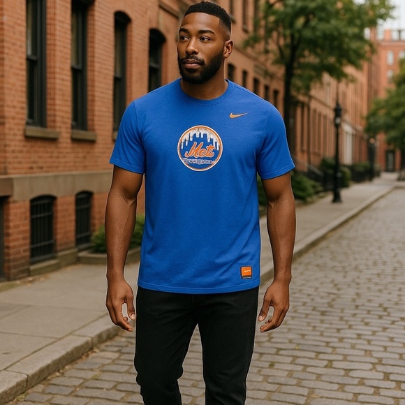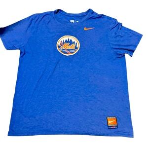 Nike tee in royal blue with Mets logo. Features orange accents. Perfect for fans.