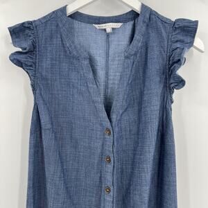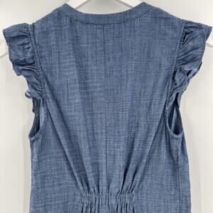 The Nines By Hatch Button Up Down Blue Chambray Denim Jumpsuit Sleeveless Flutter Sleeves Tapered Leg Stretch V-Neck Bump and Nursing Friendly Casual Perfect Fall Transition Piece