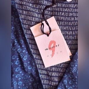 Elegant midi dress with a deep V-neckline. Features a blue and black floral pattern. Three-quarter sleeves add a stylish touch.