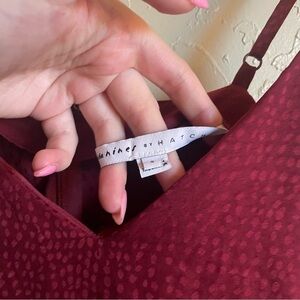 The Nines by HATCH Sleeveless Tiered Slip Maternity Dress. Sleeveless dark wine red satin dress with micro leopard print polka dot texture. Tiered hem skirt. Adjustable spaghetti straps. Zipper back.