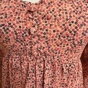 V-neck. Button placket at bust. Tie back. Babydoll silhouette. 3/4 sleeves with elastic. Short. Small ditzy floral print. Pink.