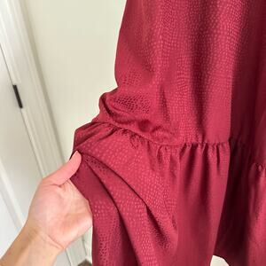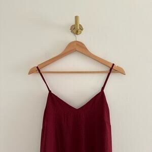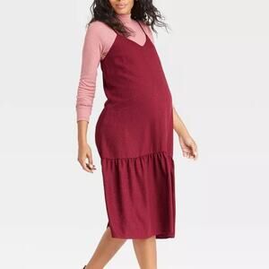 Details: The Nines by Hatch Sleeveless Tiered Slip Maternity Dress - Size: XS- Color: Red- Material: 59% Polyester, 41% Recycled Polyester- Features: Sleeveless, tiered, slip style, hidden back zip closure, machine wash, spaghetti strap, adjustable strap, V-neck, midi length, comfort, breathable, casual.