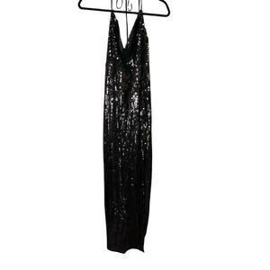 The Nookie Mira Gown is a liquid sequin gown with draped front neckline and thigh high split. Fully lined, with halter tie at back neck and invisible zip opening.