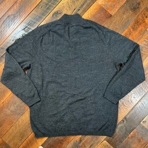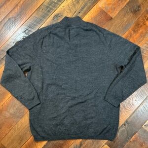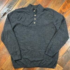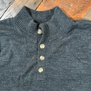 Classic and versatile The Normal Brand men’s mock neck sweater in charcoal gray. Features a quarter button placket, ribbed cuffs and hem, and soft knit blend fabric. Perfect for layering in fall and winter, pairing with jeans, or wearing to the office.