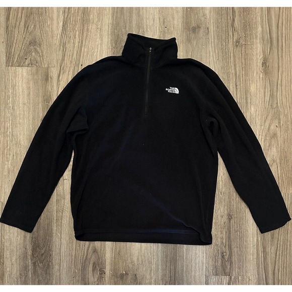 This black, lightweight fleece pullover from The North Face is perfect for chilly days. With a 1/4 zip and the iconic logo accent, it's both stylish and functional. The size is large, regular fit, and it's ideal for men who enjoy outdoor activities.