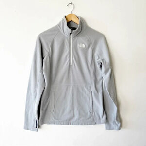 The North Face silver gray fleece lightweight 1/4 zip jacket women’s size medium. Zip sleeve pocket and loops. Preowned, light overall wear.