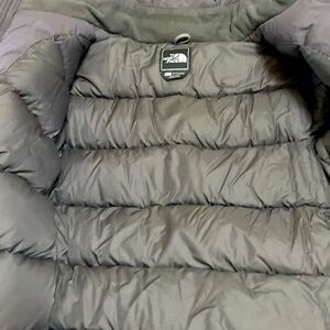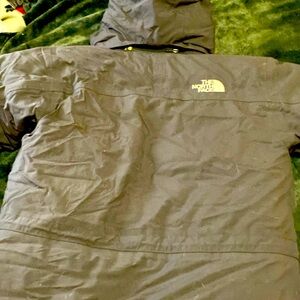 The North Face Down winter coat very warm comfortable in dark gray in excellent condition pre owned but not a lot of wear no tears wholes or stains no odor like new 6 pockets detachable hood fully zipped high neck
