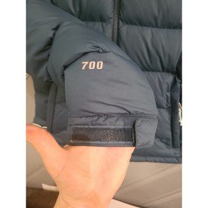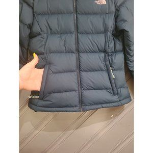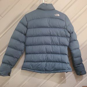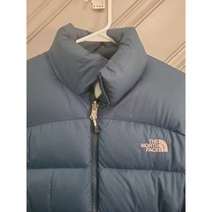 Gently used, womens small, blue/green color, zippers all work, no attached hood, no holes, no rips, down filled, fitted style, 20.5 inch from pit to pit, 23.5 inch Shoulder to Hem.