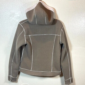 A5 Series North Face fleece coat in a greyish brown. Large hood, button closure, 2 outer & 2 inner pockets.