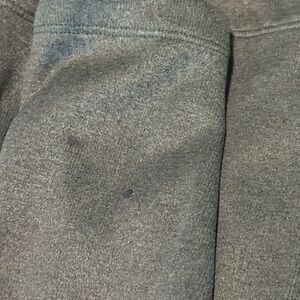 Warm fleece jacket by The North Face. Olive and charcoal colors. Stay warm and stylish with The North Face's blue fleece hoodie, featuring a full-zip front and a stand-up collar. This classic design is crafted from durable fleece material, perfect for layering during outdoor adventures. Enjoy the comfort and quality synonymous with The North Face. Two small spots on one cuff, pictured.