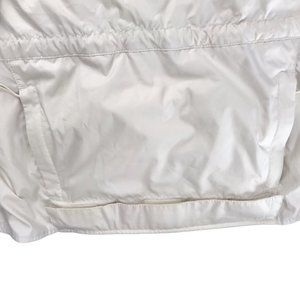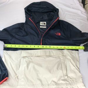 The North Face Anorak Hooded Windbreaker with Kangaroo Pouch. Dark Blue White color block. Size Women's Small. Half-Zip. Made in Vietnam.