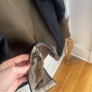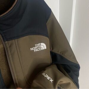 Cool Apex jacket from The North Face, black and brown color. Logos on front and back. Absolutely perfect condition except for the cuffs, see those spots. Could be mended, but doesn’t really affect the fit or look. Cinches at bottom. Full-zip.