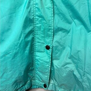 Aqua jacket with navy lining. Is made from Gore Tex waterproof materials. Hooded design with button and zipper closure. Lightweight and stylish. Does feature spots faint throughout