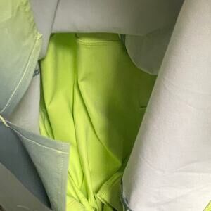 Gray with subtle yellow trim at the bottom, has inner attached bodysuit shorts in a bright yellow, racerback style with logo at the chest and on the back