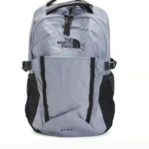 Adjustable heavyduty backpack, padded straps, logo detail, dual entry design, interior laptop sleeve 15inW x 20in H zip closure 1 front pocket, 2 side pockets. The North Face Dyno Backpack. The North Face Dyno Backpack. Embark on your next adventure with this ultraversatile pack. 600D 50% recycled polyester with non-PFC durable water-repellent (non-PFC DWR) finish (Solids) 300D heathered polvester with non-PFC durable water-repellent r(non-PFC DWR) finish (Heathers) 100% recycled trim FlexVent suspension system Two webbing top handles Padded, protective 15" laptop Sleeve. Front compartment has secure-zip pockets, tablet sleeve and key fob 360-degree reflectivity Two exterior water bottle pockets Exterior stash pocket Sternum strap with whistle buckle Contrast embroidered The North Face logo on front Average weight: 1 lb. 12 oz. (795 g) Volume: 1660 in (27.2 liters) Laptop sleeve: 11.5"h × 11"d Dimensions: 18"h × 11"W × 8.5"d