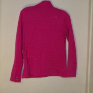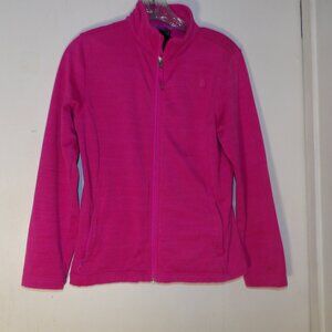 hot pink , fully zip up with Zippered side pockets , long sleeves , 93% Polyester 7% Elastane , Big Girls Sz L measurements are roughly 23" from shoulder to hem and about 18" pit to pit , good used condition no holes , spot on one cuff isn't as large as a dime and I haven't tried stain removal , shows minor washing wear or light pilling . Pet friendly non smoking home